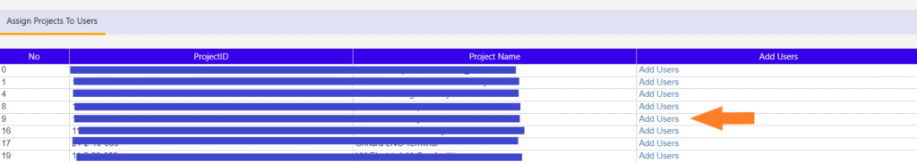 • The ‘Assign Projects’ will prompt a page which contains list of all projects done within Haz360®. Click on ‘Add Users’ corresponding to the project to which users have to be assigned.