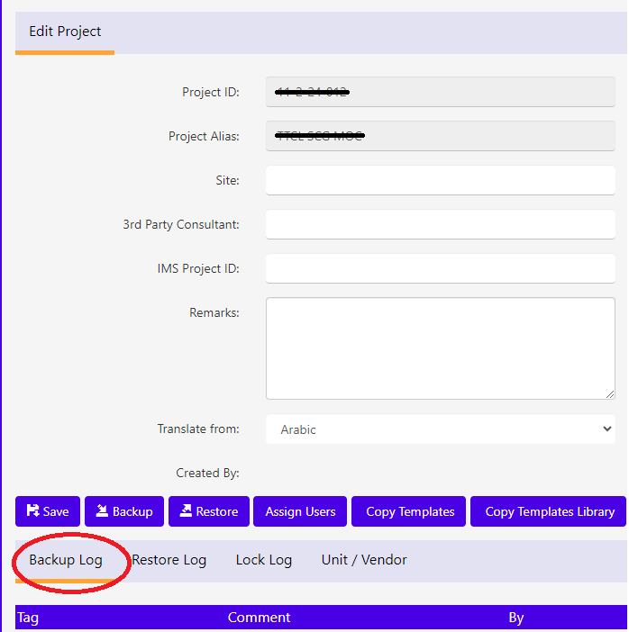 Upon “Backup” click a new screen will be shown as below. It shows the project selected for backup.  User can input any “Tag” / “Comment” information (optional) followed by “Download Backup” click.