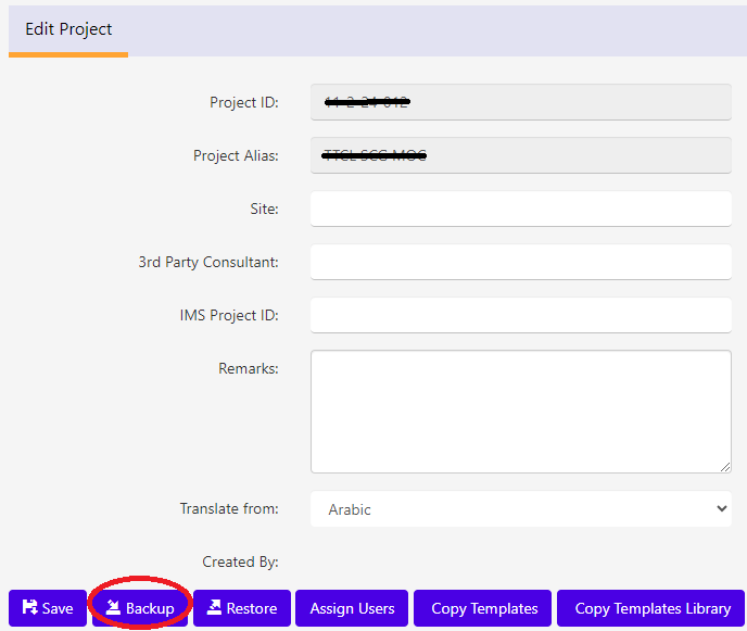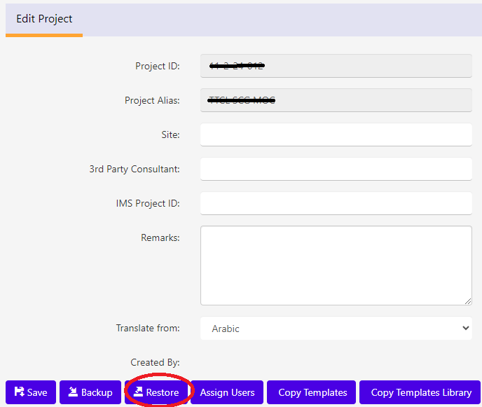To “restore” project data from backed up file, click “Restore” button as shown in the image