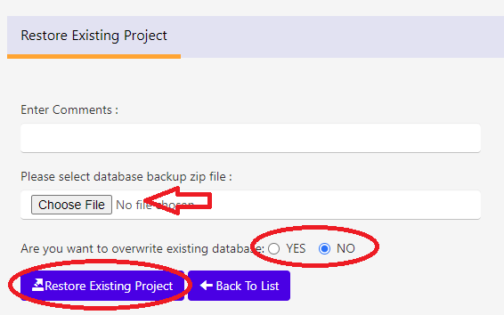 Upon “Restore” click a new screen will be shown as below.  User can input any “Comments” (optional), upload the backup file by “Choose File”.  User either overwrite the current data with backup or they can create new version of data. By default, new version of data has been selected.  Click “Restore Existing Project” will restore the data and status message will be shown.