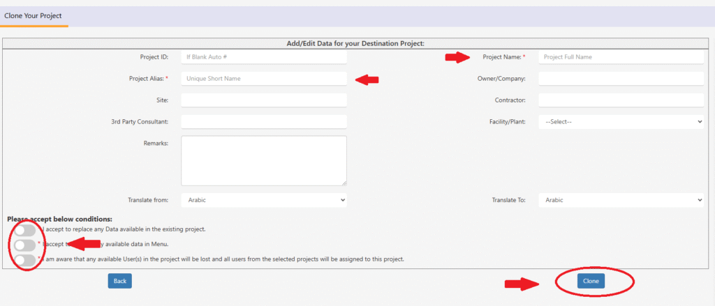 3) Clone with Users- Will copy all the user details assigned from Source project.